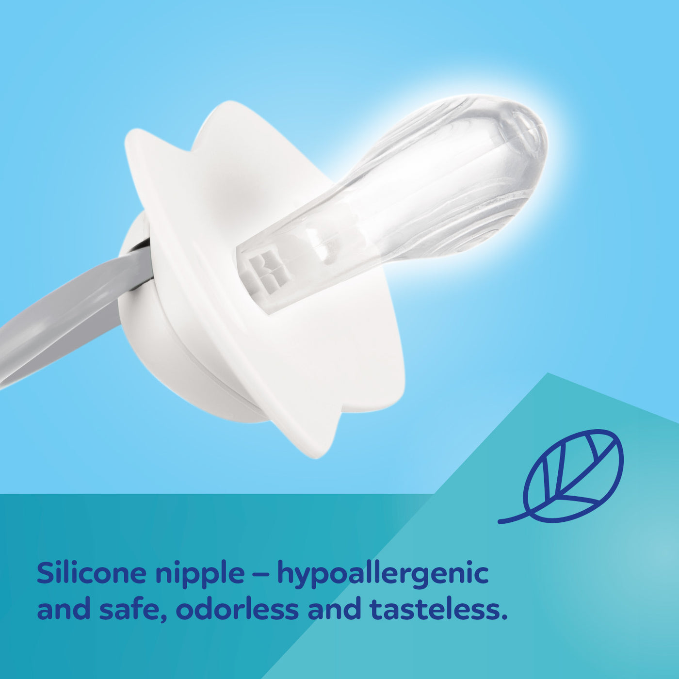 Exceptionally soft nipple requires less effort when sucking, which makes it easier for the baby to accept the soother. The nipple is made of 100% hypoallergenic and safe silicone, it is odorless and tasteless. Specially profiled shield allows the baby to breathe freely through the nose and minimizes the soother's imprints on the baby's delicate face. Additional ventilation openings allow the skin to breathe and prevent skin irritation. Comfortable handle of the soother makes it easier to give it to the child and allows you to attach a soother chain or ribbon that will protect the soother from being lost or falling to the ground and getting dirty.